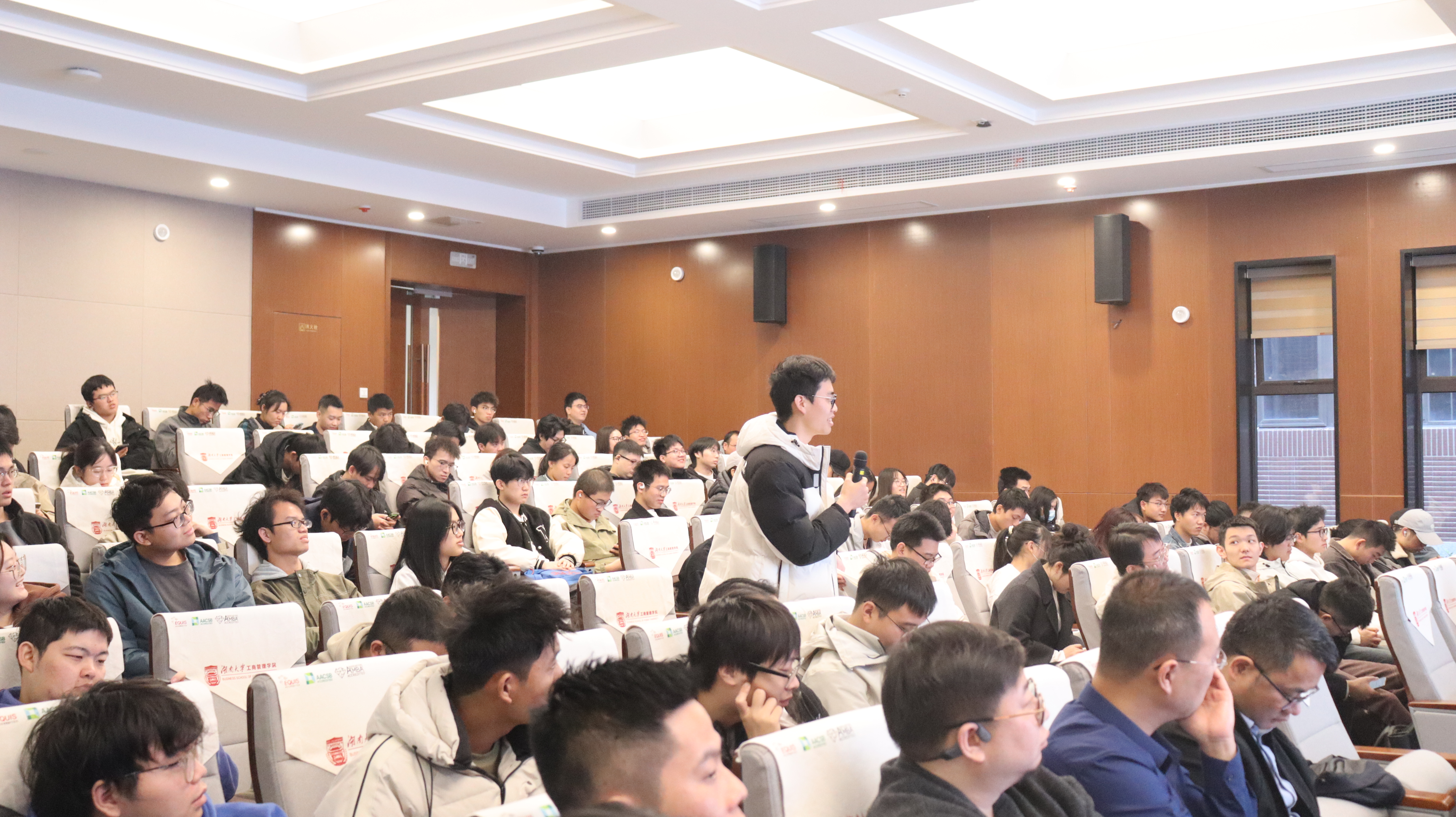 在最后的互动环节,人工智能与机器人学院学生就“人生道路选择”与“人生梦想”向魏育成总提问。魏总结合自身创业经历,分享了基于第一性原理的决策思考与坚持自主研发的心路历程。他深情表示,自己的人生梦想是脚踏实地办好中科亿海微,让产品赢得市场认可,构建一个股东、客户与员工共同受益的“奋斗者家园”。他强调,“奋斗即幸福”,并希望今天的分享能在同学们心中播下种子,激励未来涌现更多优秀的企业家与科学家。这番真挚的讲述,生动诠释了企业家精神与母校情怀的传承,赢得了全场持久而热烈的掌声。