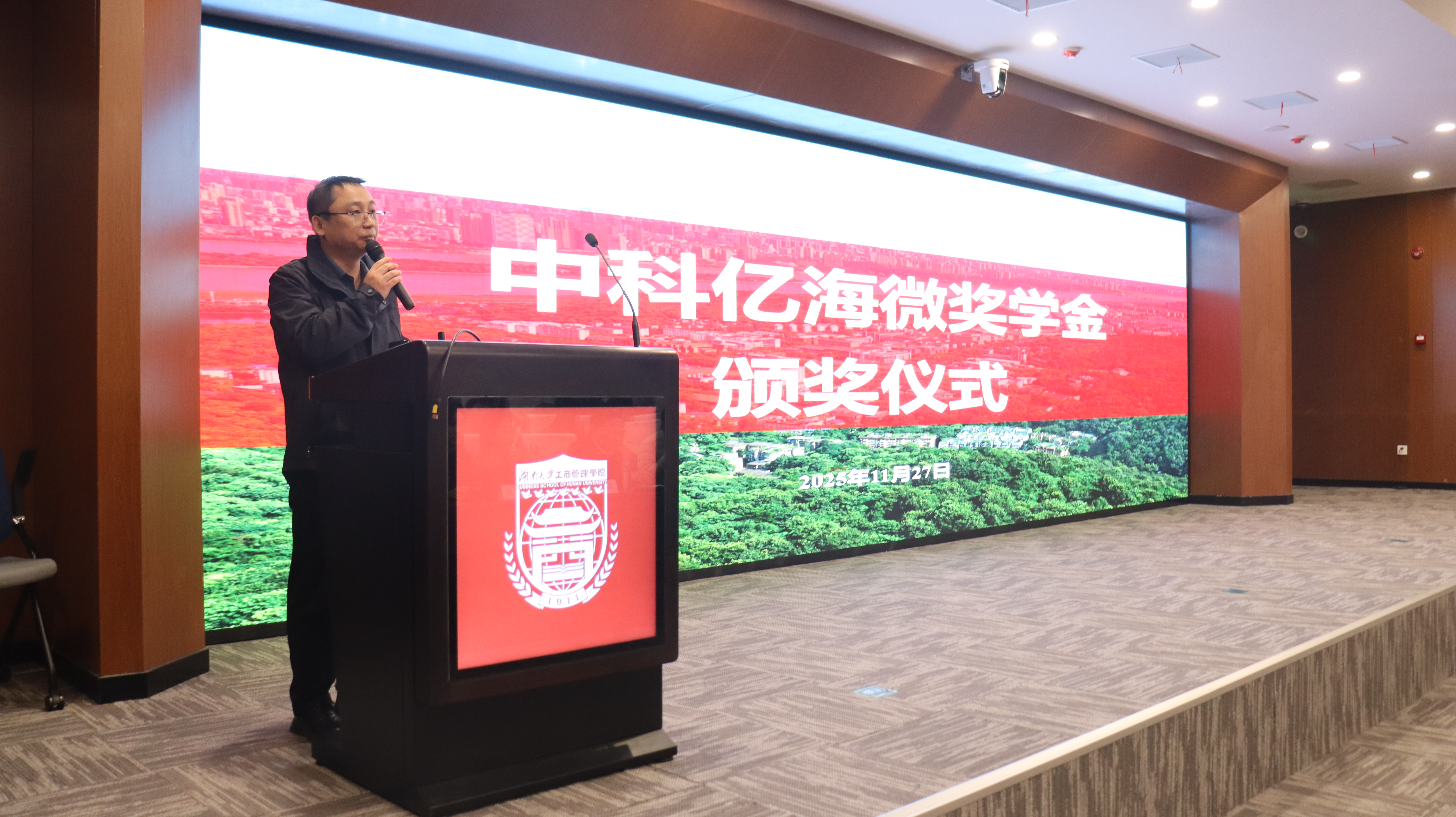 11 月 27 日上午,机器人视觉感知与控制技术国家工程研究中心 2025 年度 “中科亿海微奖学金” 颁奖仪式,在湖南大学前进楼举行。中科亿海微电子科技(苏州)有限公司总裁、中科亿海微奖学金捐赠者、湖南大学1993级校友魏育成及公司管理层代表,中国工程院院士、中心主任王耀南,中心副主任朱文峰,人工智能与机器人学院党委副书记、纪委书记彭薪羽,全体获奖学生及中心师生共同出席了本次仪式。