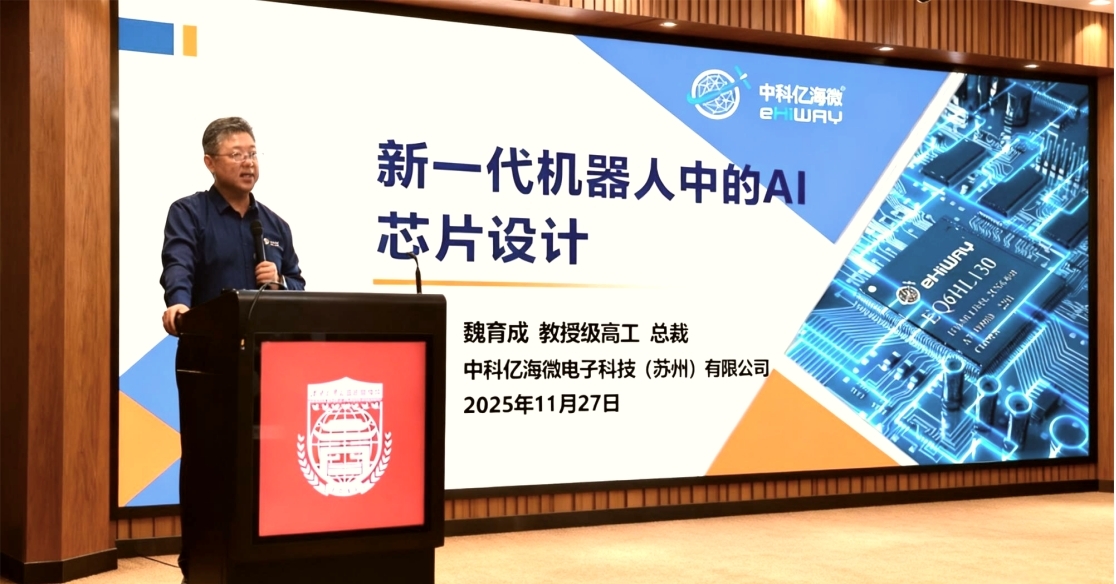 颁奖仪式结束后,中科亿海微总裁魏育成为在场师生带来了一场题为《新一代机器人中的AI芯片设计》的精彩学术报告。魏总从传统机器人与新一代机器人的演进谈起,深入剖析了FPGA技术在机器人AI芯片中的关键作用,并详细介绍了中科亿海微在FPGA芯片领域的自主创新与产业实践。报告内容前沿、见解独到,引发了师生的浓厚兴趣。